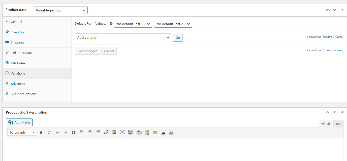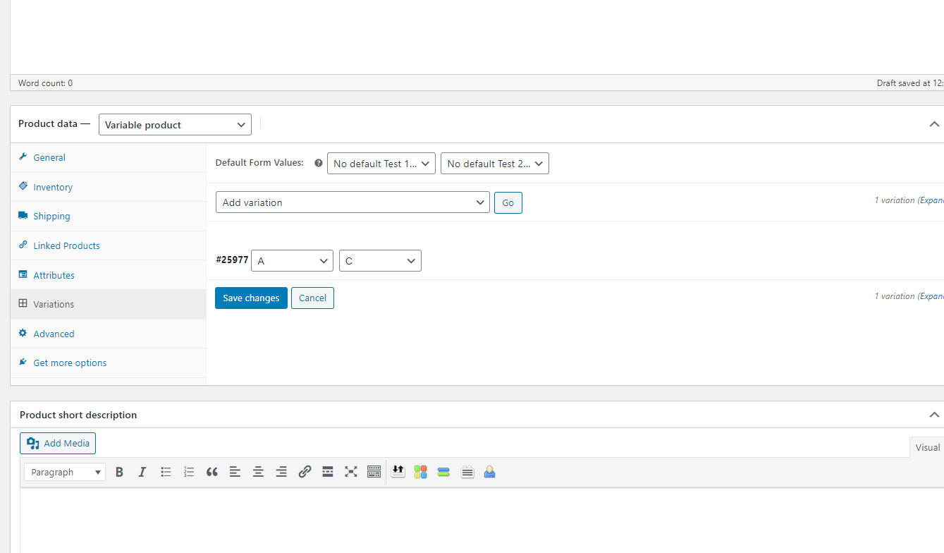 “Save changes” button is now grayed out, and it says there is “1 variation” on the right hand side, but this also ends up disappearing and ultimately being blank and deleted.